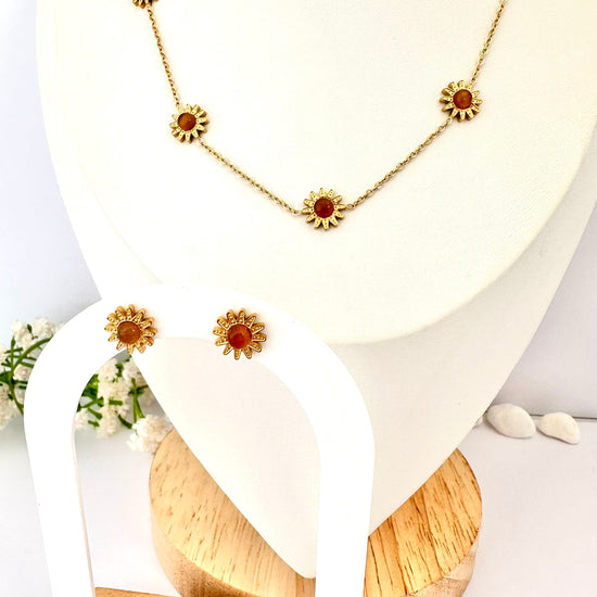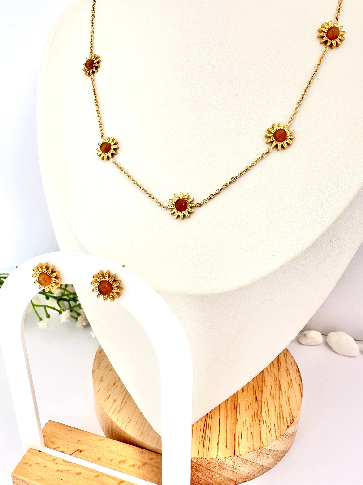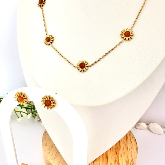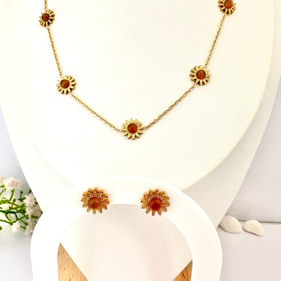El Conjunto Flor Dorada con Centro Ámbar irradia calidez y estilo. Inspirado en la naturaleza, combina delicadas flores doradas con un centro color miel que aporta luminosidad y elegancia a cualquier look.