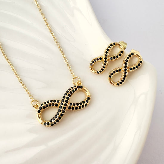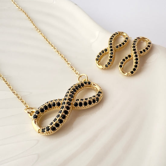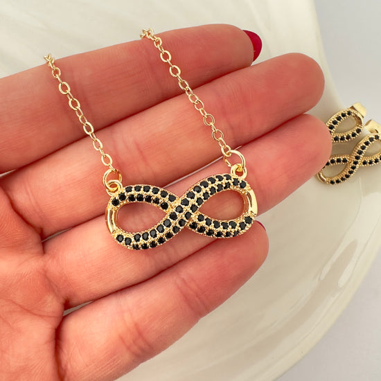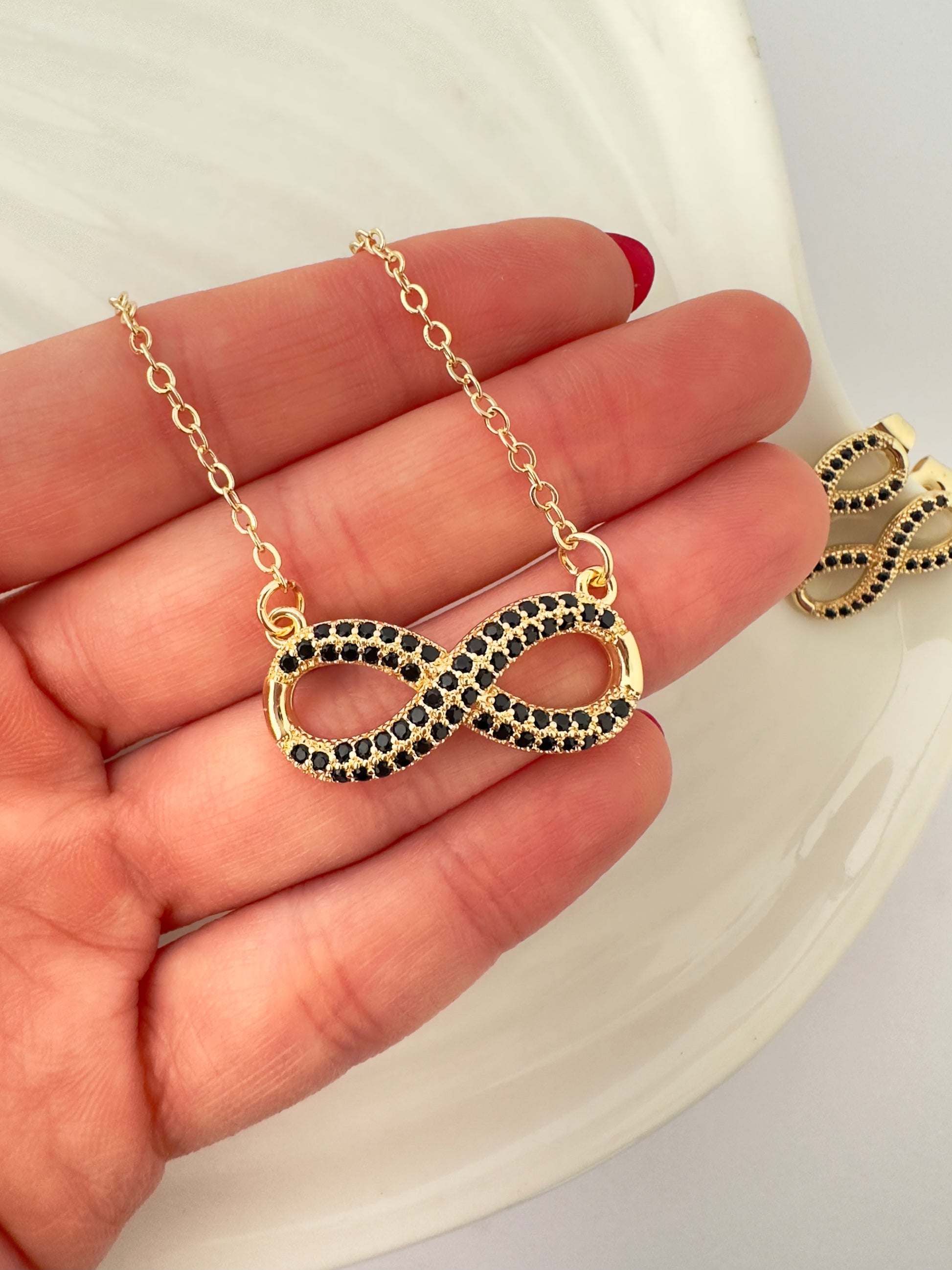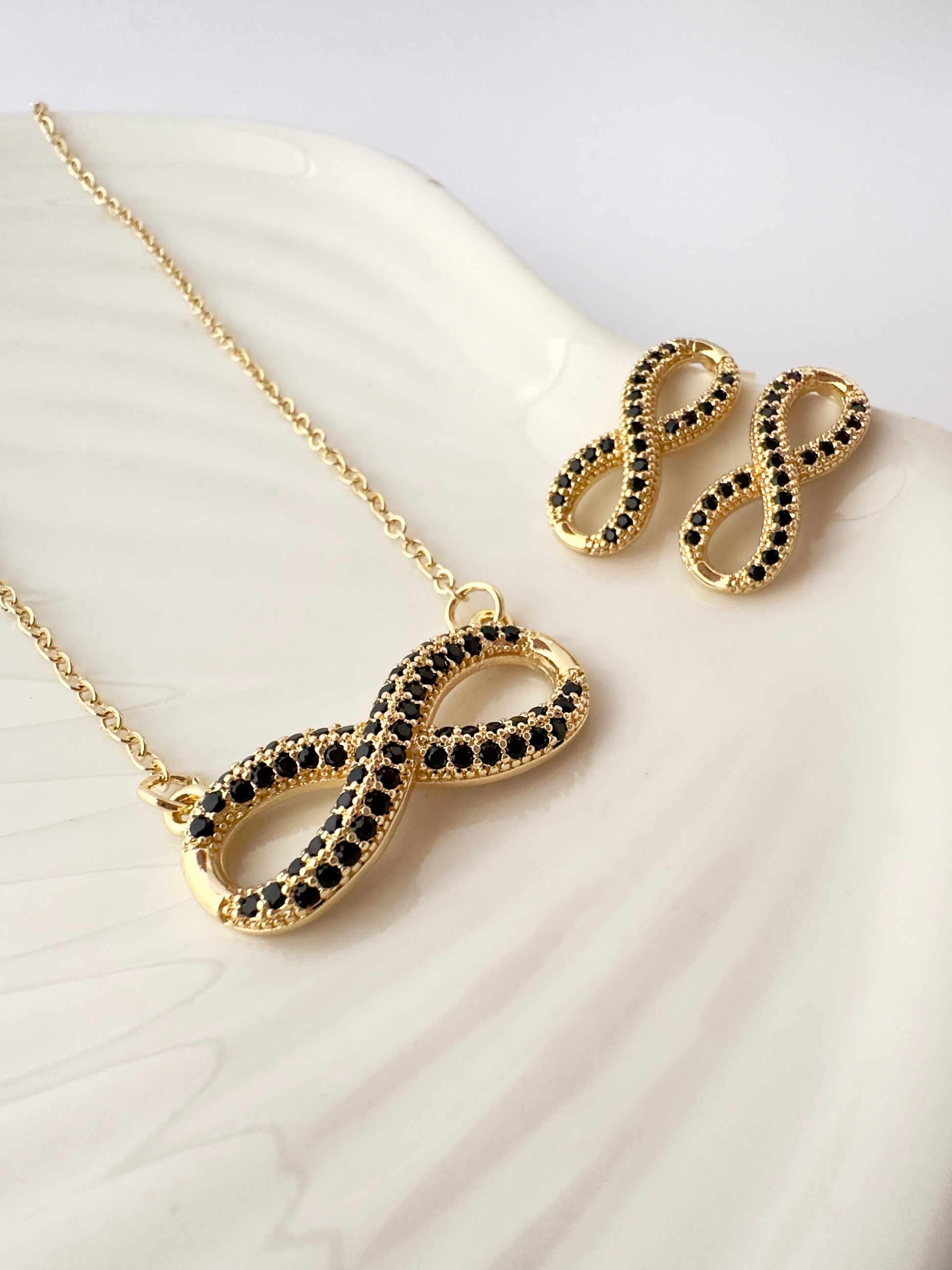 Un diseño moderno y sofisticado que representa la conexión eterna. Este conjunto con símbolo de infinito y circones negros combina elegancia y significado en una joya versátil y atemporal. Su brillo oscuro aporta un toque de misterio que resalta cualquier look.
