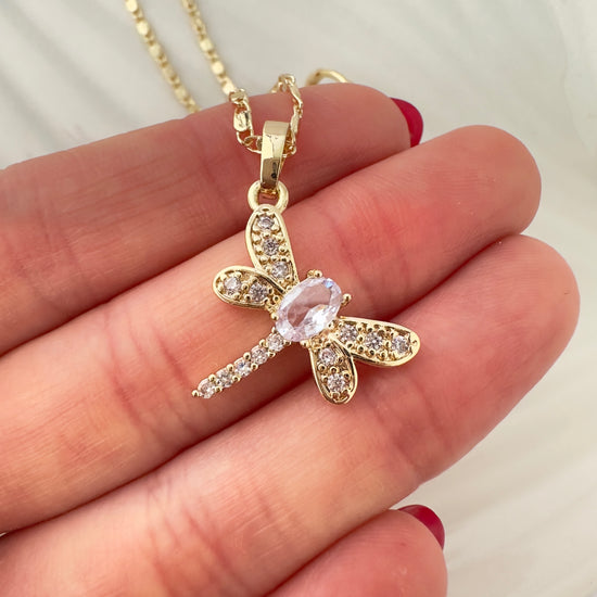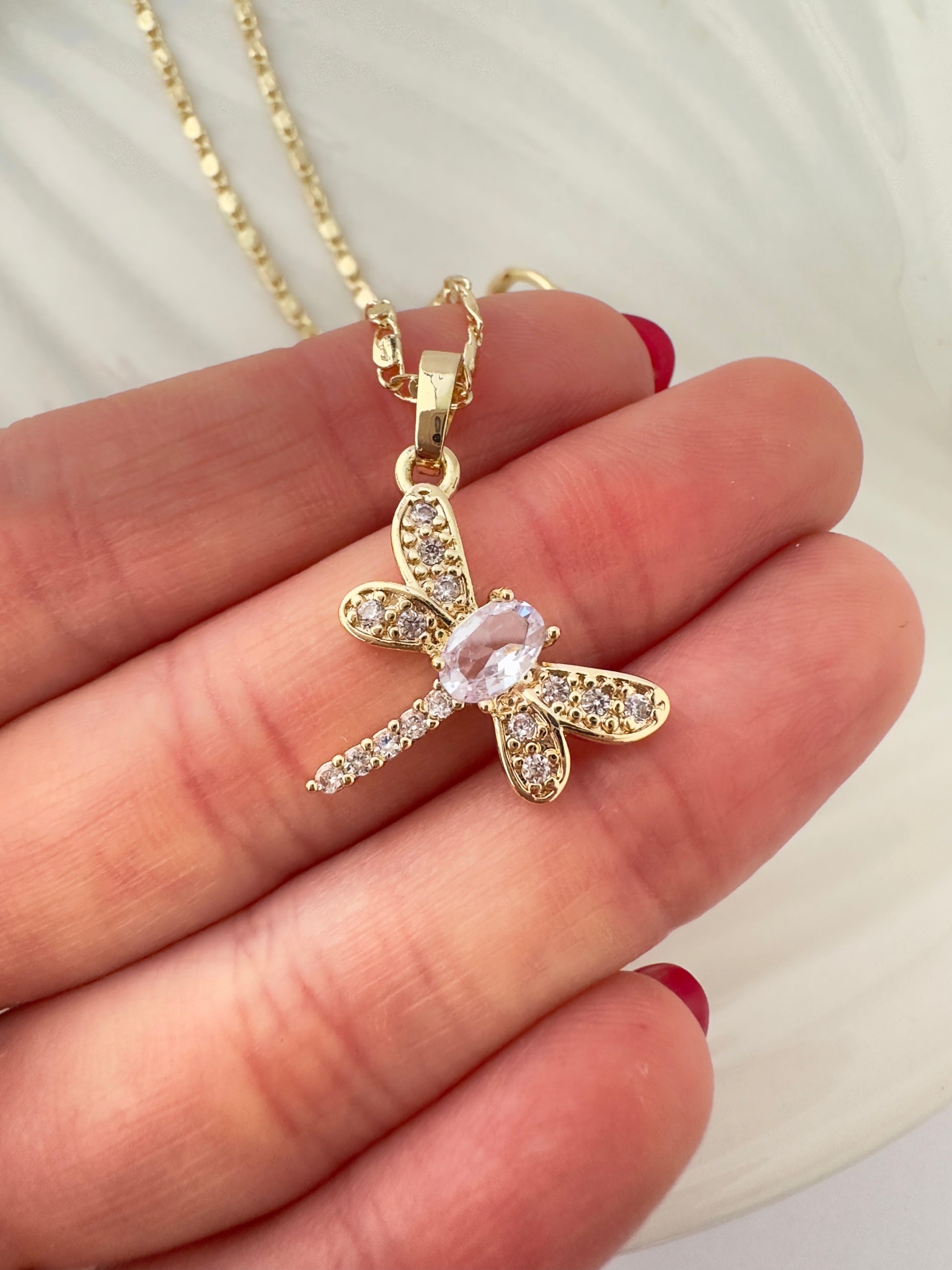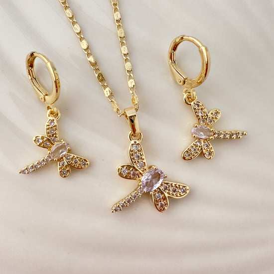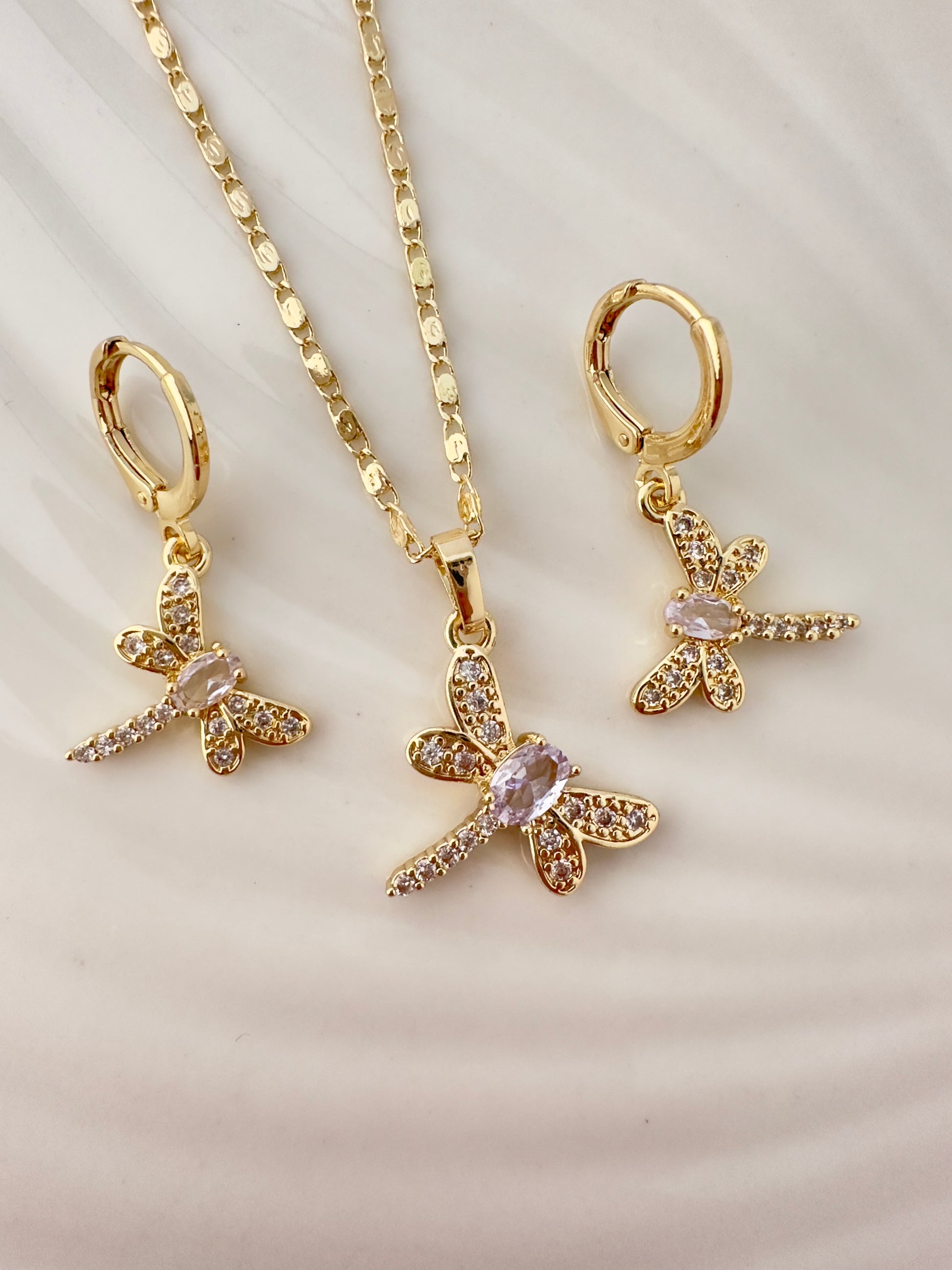 Elegante, etéreo y lleno de luz. Este conjunto con forma de libélula está adornado con circones blancos que capturan cada destello, creando un efecto sutil y encantador. Un diseño ideal para quienes aman la delicadeza de la naturaleza con un toque sofisticado.
