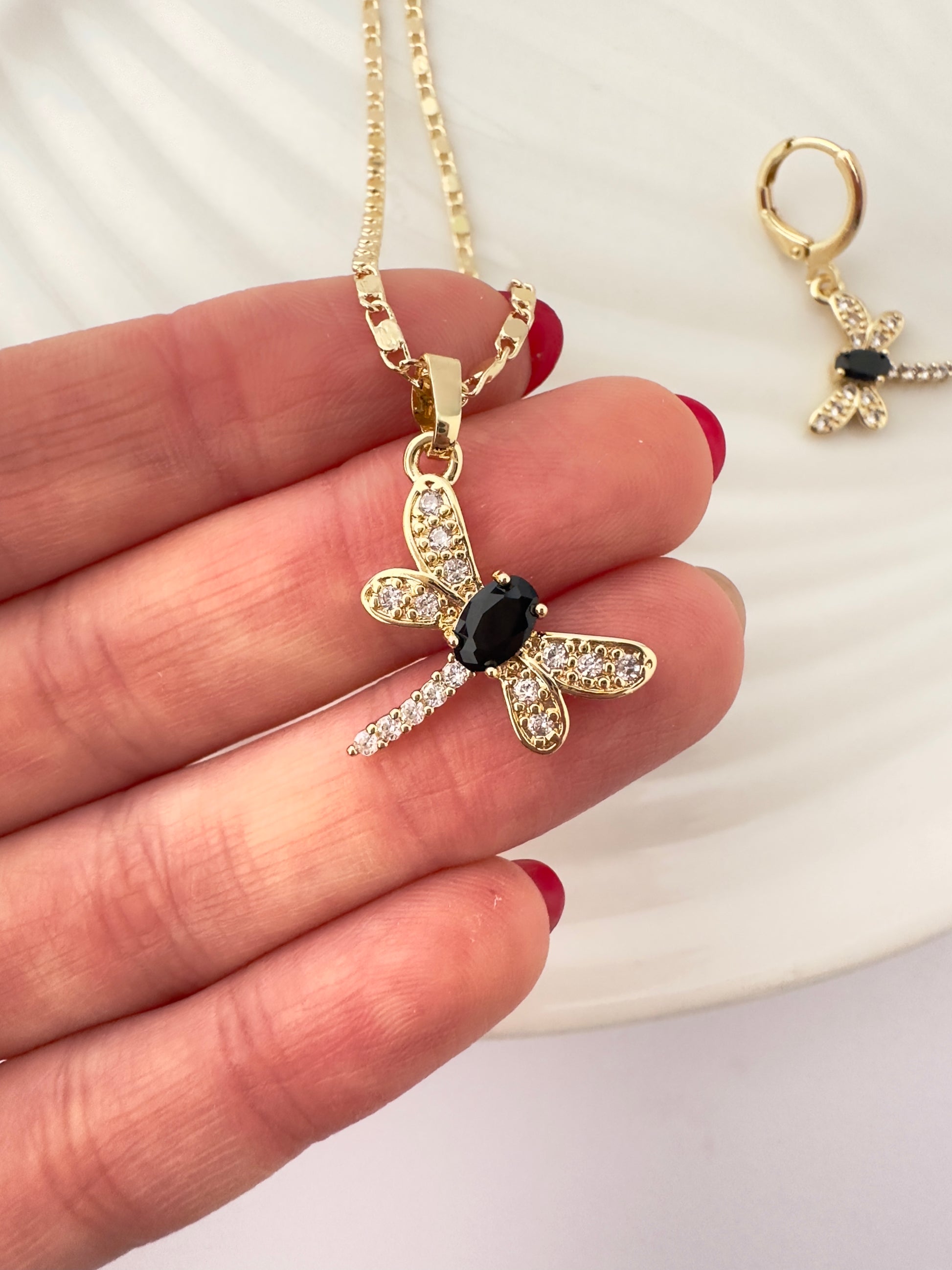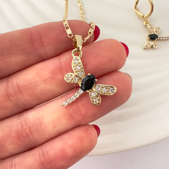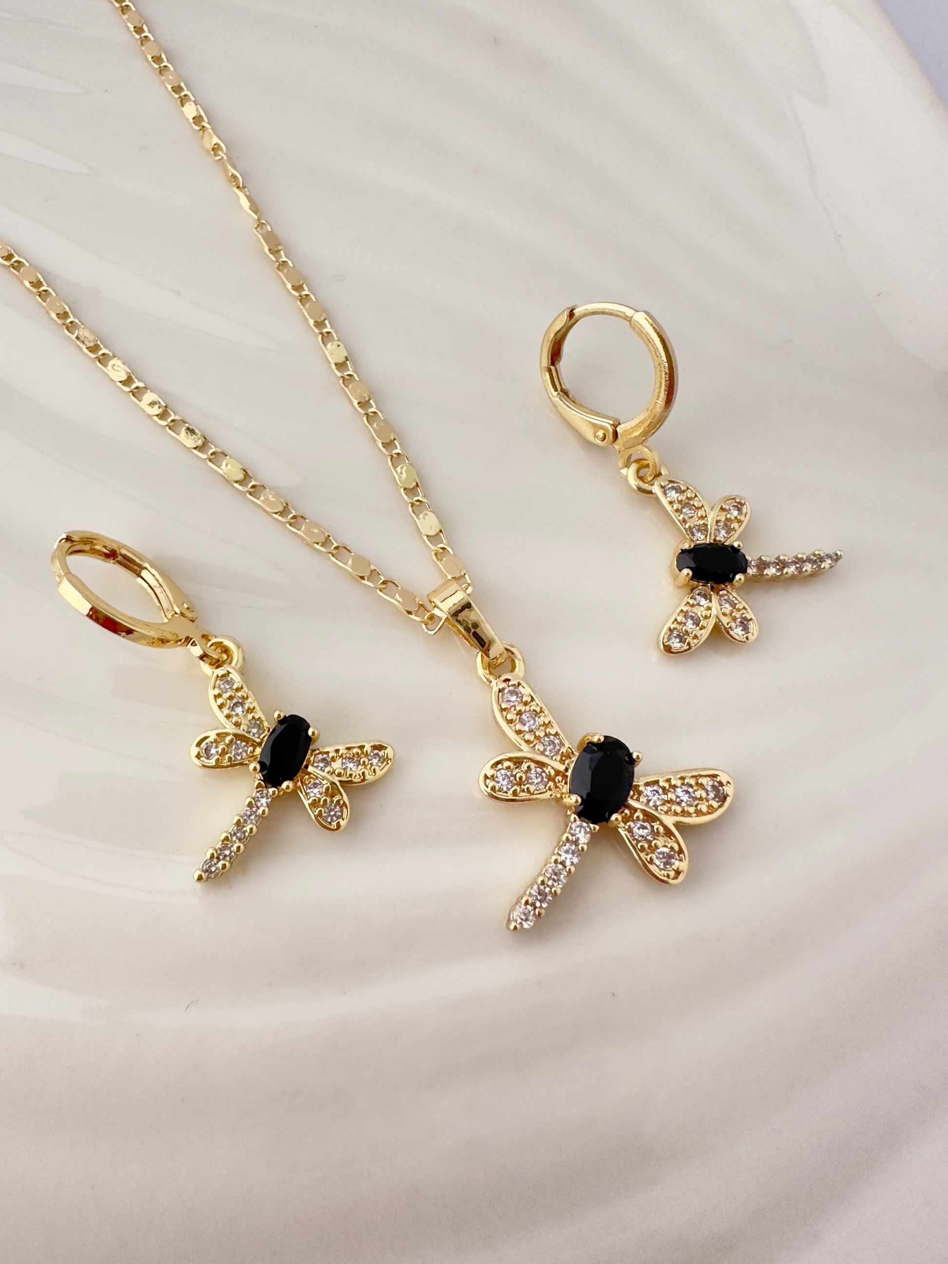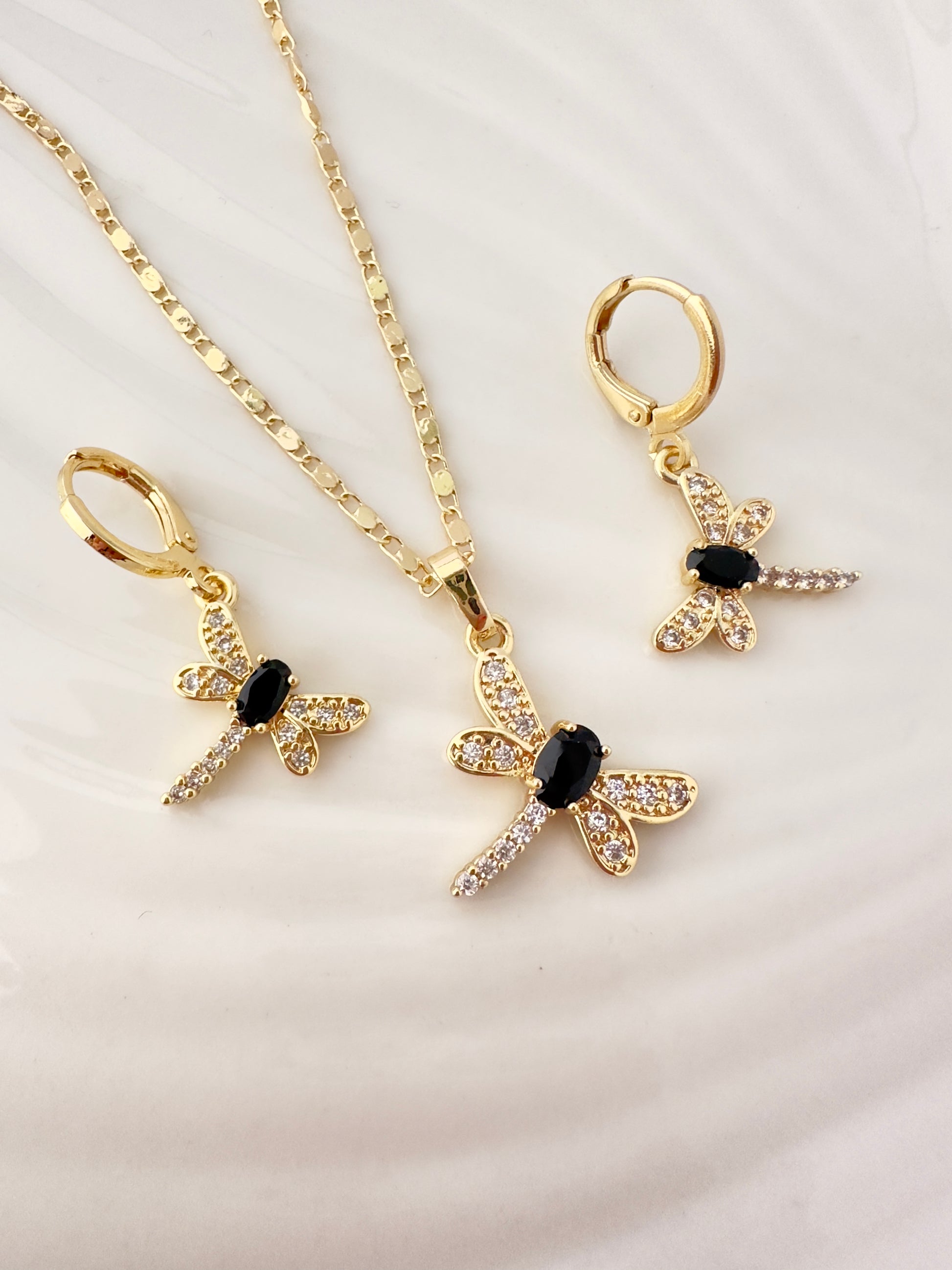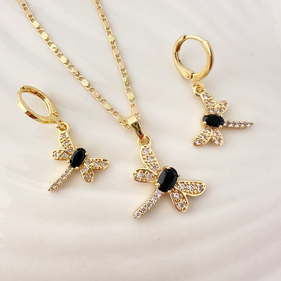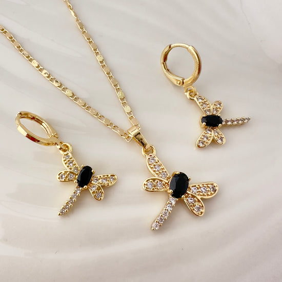 Este conjunto destaca por su diseño de libélula, símbolo de transformación y libertad, realzado con un contraste sofisticado entre circones blancos y un centro en circon negro. Su estética elegante lo convierte en una joya versátil, ideal tanto para ocasiones especiales como para uso diario con un toque distintivo.