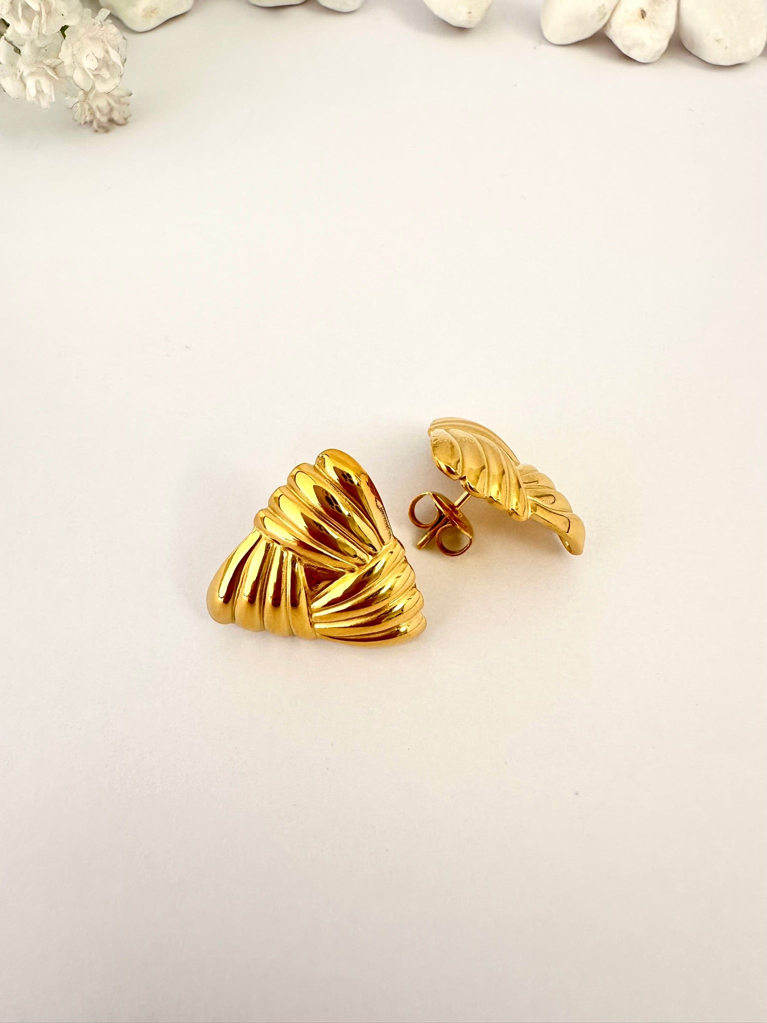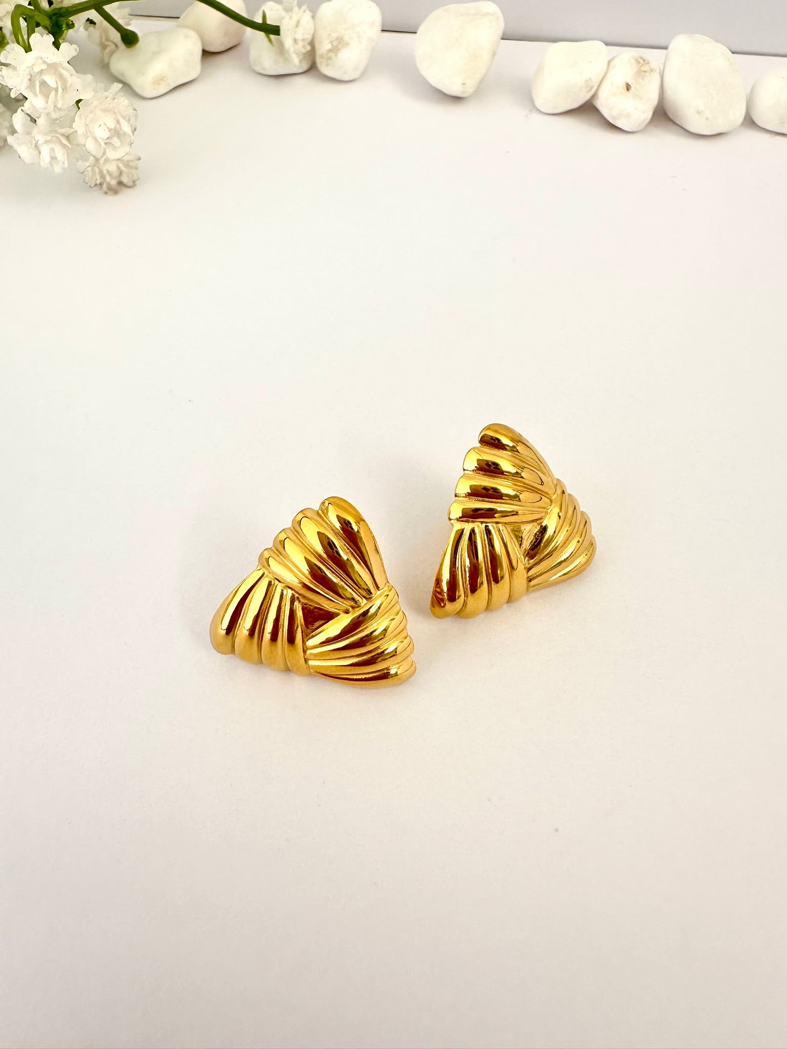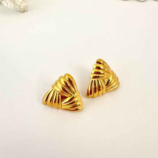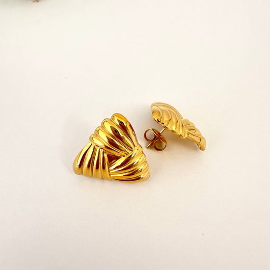 Estos pendientes dorados con forma triangular y textura esculpida destacan por su diseño estructurado y elegante. Su acabado brillante refleja la luz con fuerza, creando un efecto sofisticado y moderno. Una joya con presencia, perfecta para quienes buscan un estilo audaz y refinado.