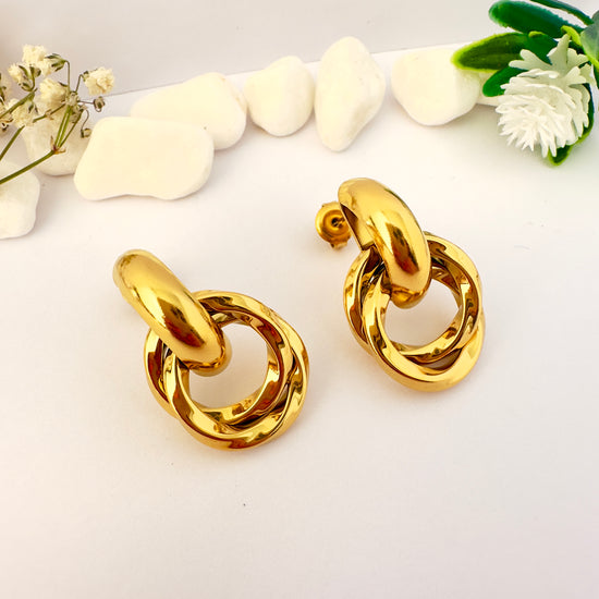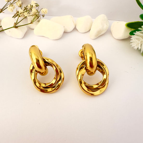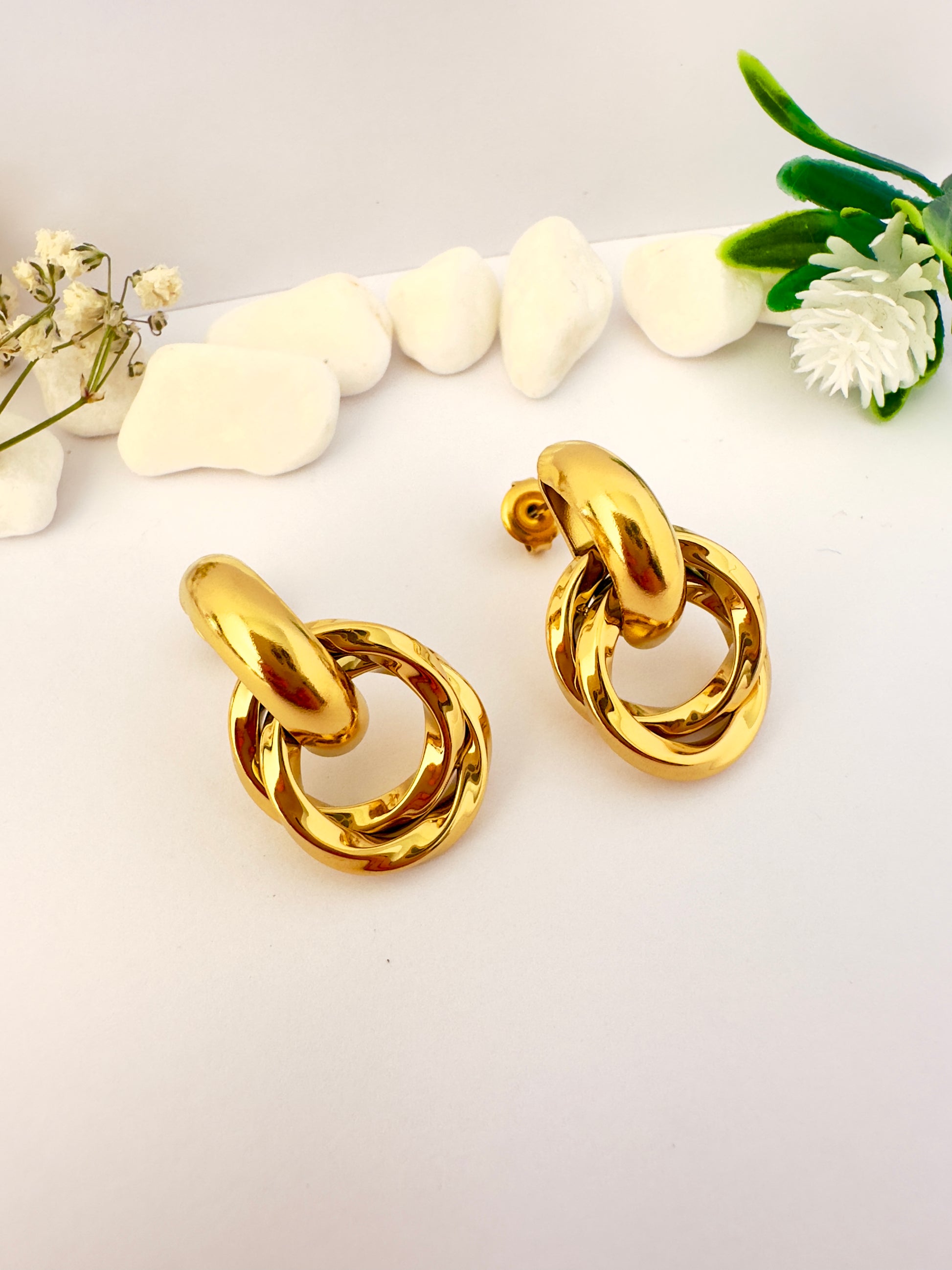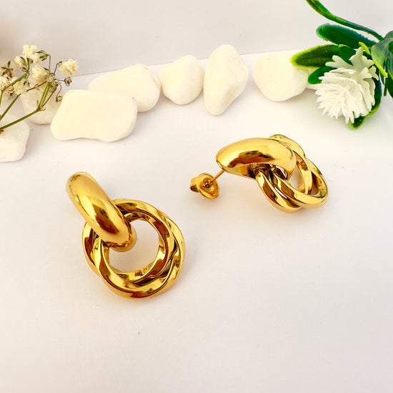 Pendientes de acero inoxidable enchapados en oro 18K con doble aro entrelazado, un diseño elegante y moderno que combina con todo tipo de looks. Perfectos para destacar en cualquier vitrina online por su estilo contemporáneo y alto brillo.