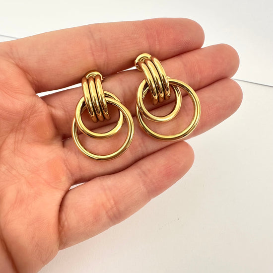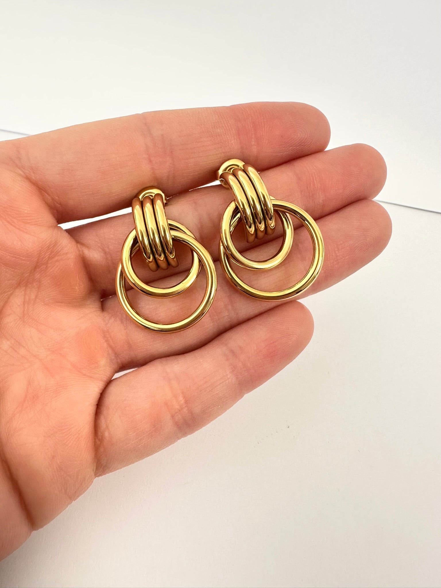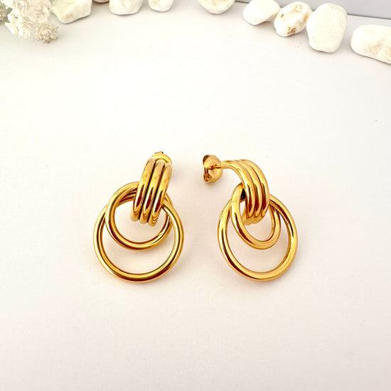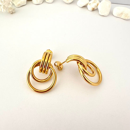 Estos pendientes presentan un diseño moderno con aros entrelazados que simbolizan conexión y armonía. Su acabado dorado brillante realza la luz desde cualquier ángulo, aportando elegancia y carácter. Una pieza contemporánea que combina estilo y sofisticación en un solo accesorio.