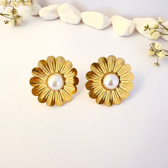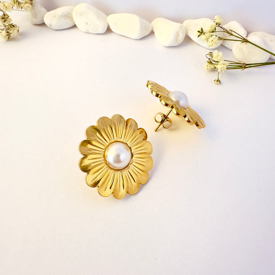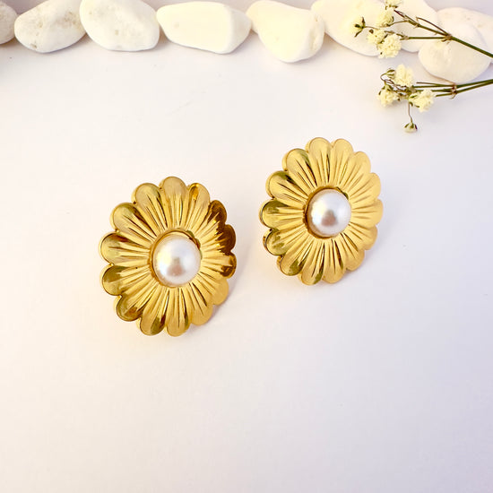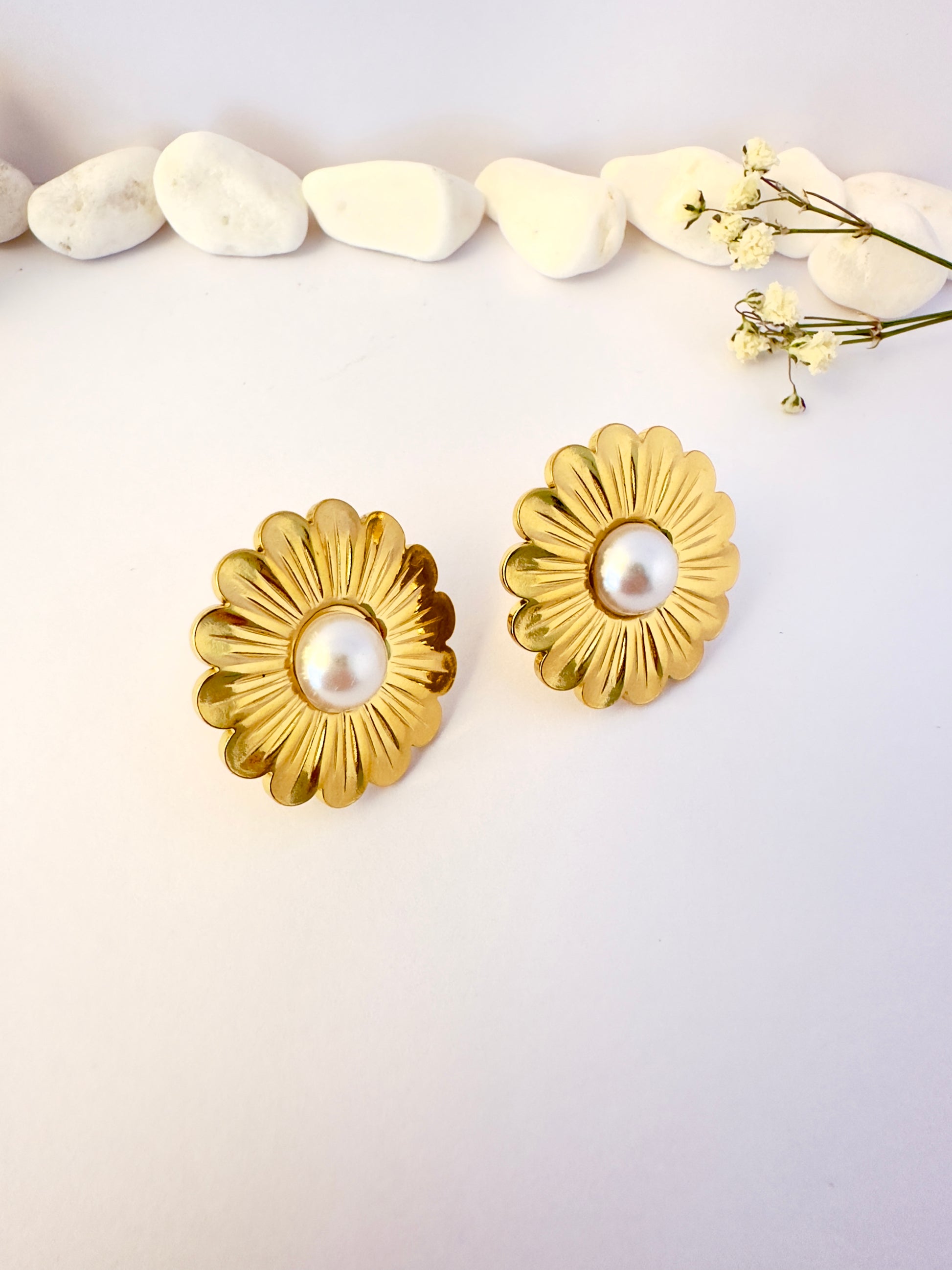 Pendientes flor vintage con perla, un diseño romántico y elegante que destaca por su forma de margarita tallada y perla central. Perfectos para dar un toque cómodo y femenino a cualquier look.