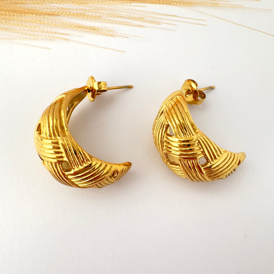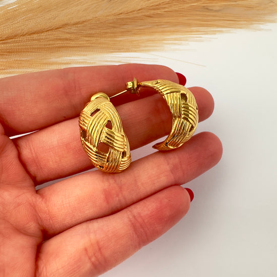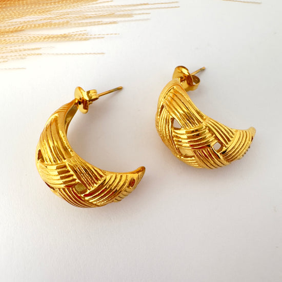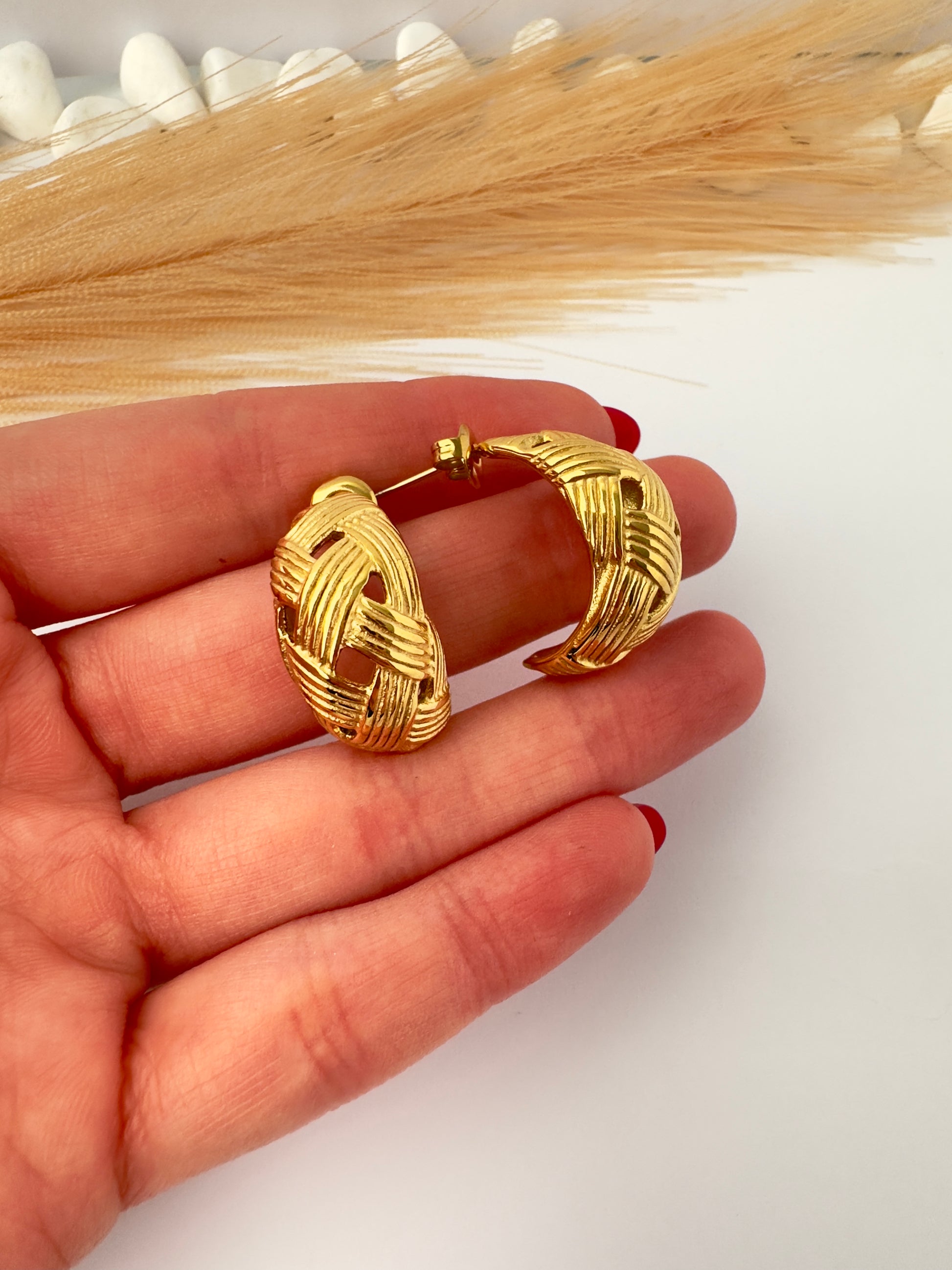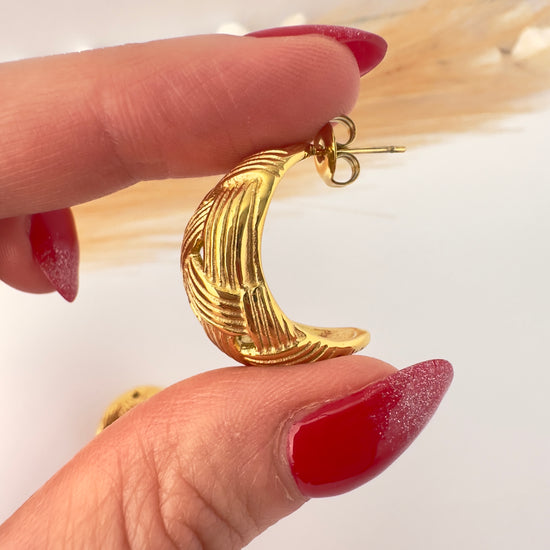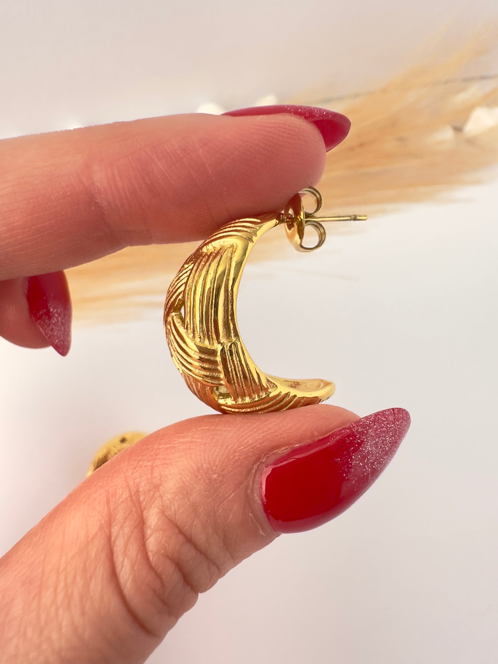 ✨ Una joya que combina textura artesanal con diseño moderno. Estos aros en forma de media luna tienen un relieve trenzado que capta la luz de forma elegante. Un modelo llamativo pero sofisticado que no pasa desapercibido.