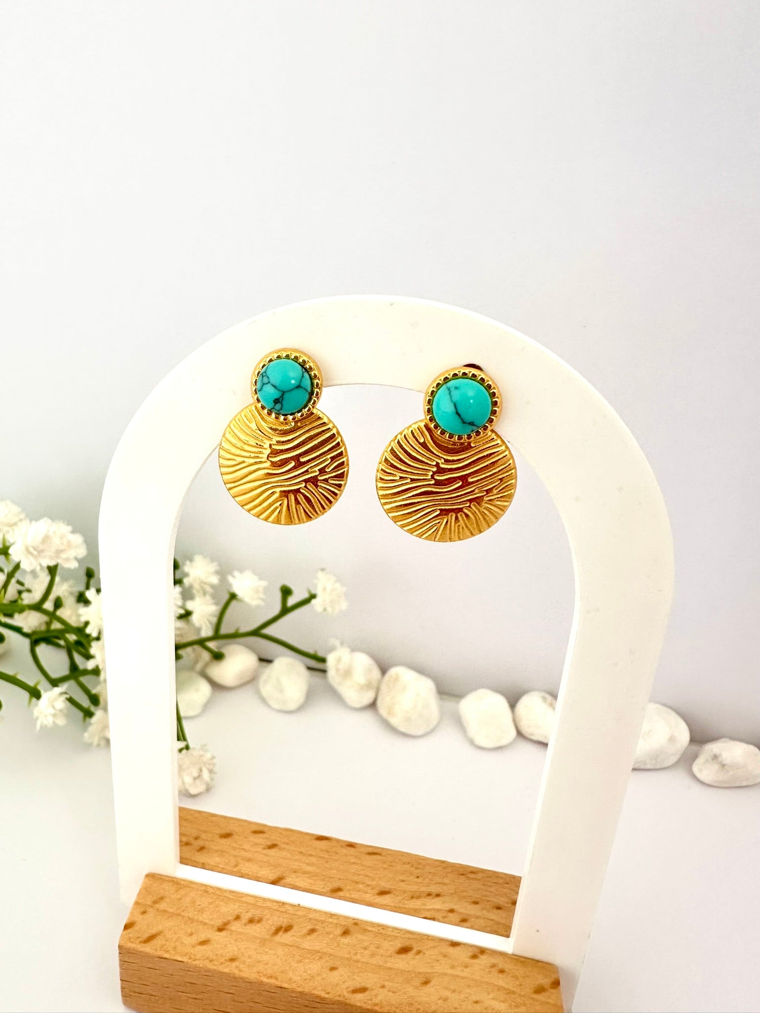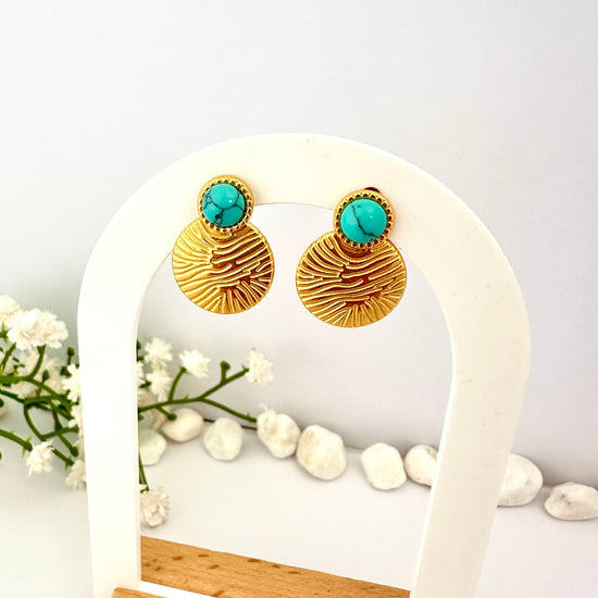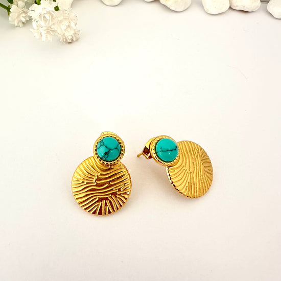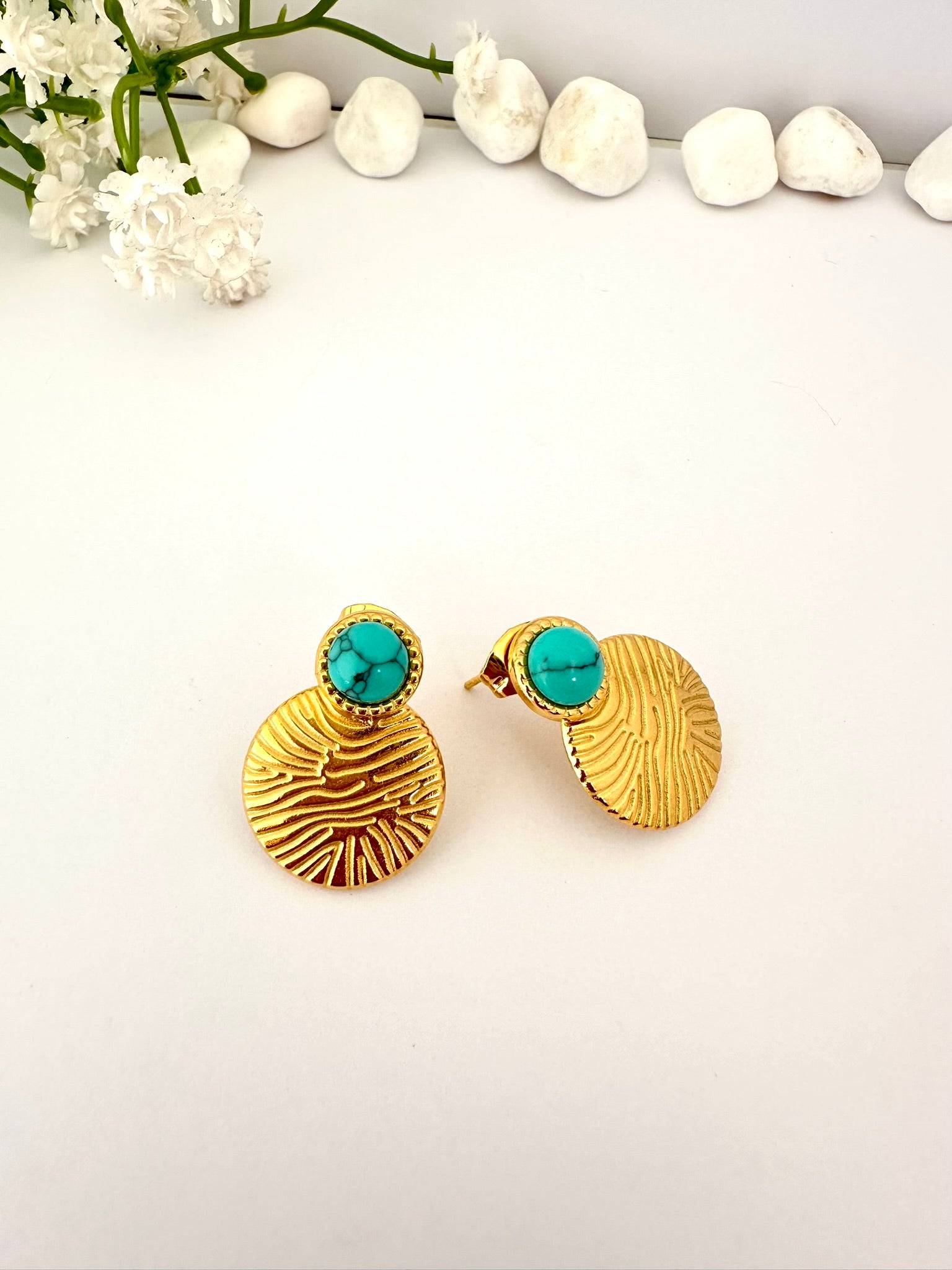 Inspirados en la belleza natural de las piedras turquesa, estos pendientes combinan el brillo del oro con la energía del color azul. Su base dorada texturizada y la piedra central aportan un toque artesanal y elegante, creando una joya única que transmite calma, estilo y sofisticación.