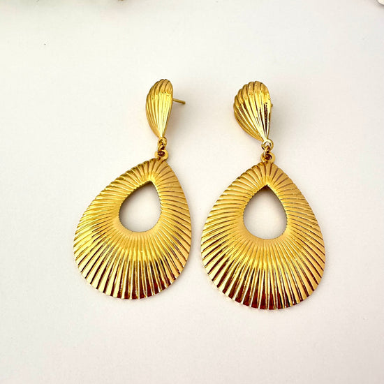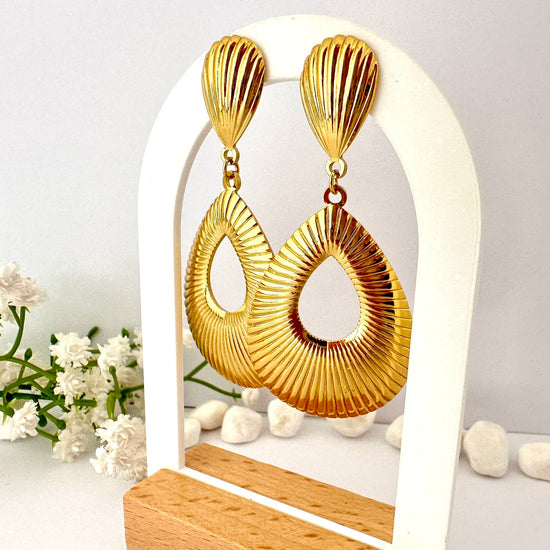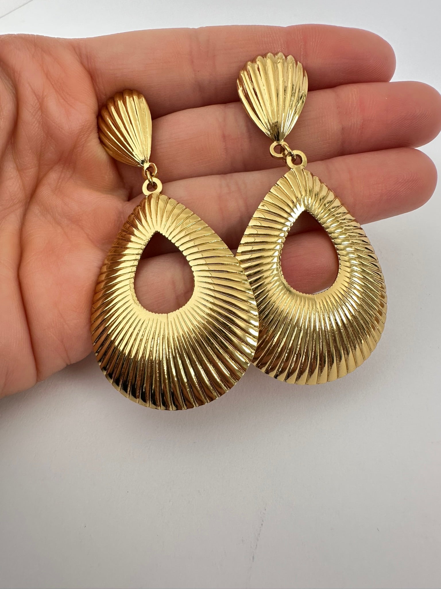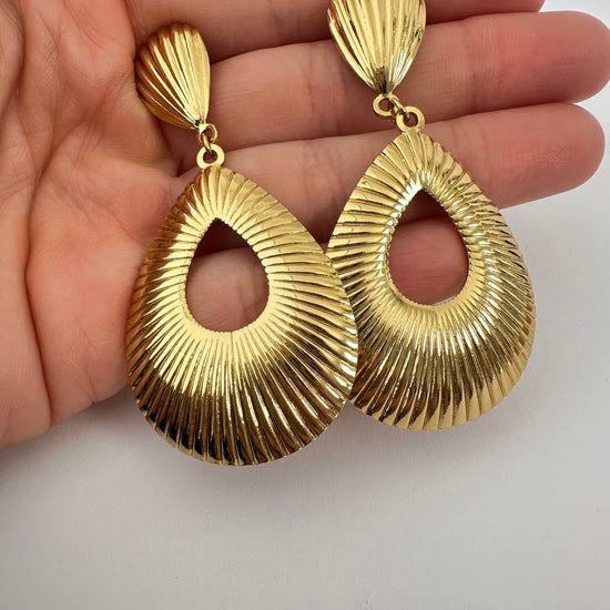 Estos pendientes largos de aproximadamente 4.5 cm destacan por su diseño en forma de gota con textura acanalada que refleja la luz con cada movimiento. Su acabado brillante y elegante aporta un toque de sofisticación, ideal para quienes buscan una joya llamativa, moderna y atemporal.