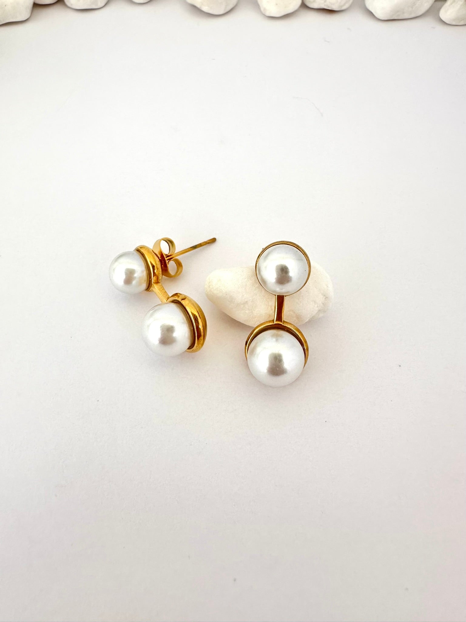 Detalles: Doble perla blanca con estructura dorada