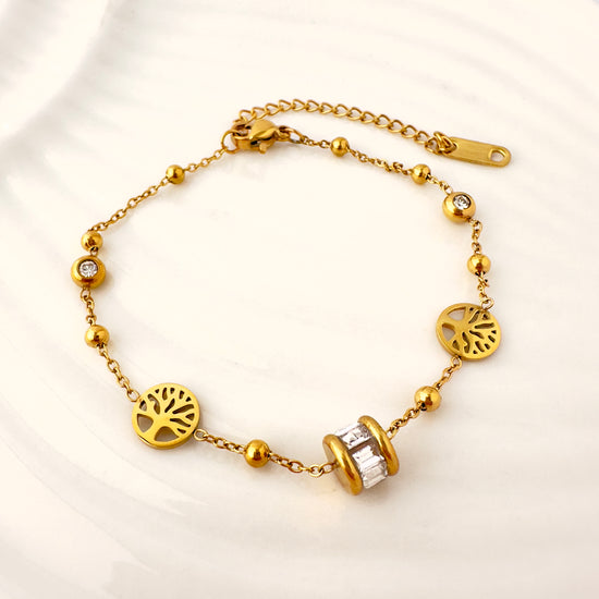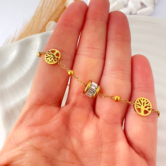 Una pulsera delicada y simbólica que combina elegancia con significado. Con dijes del Árbol de la Vida, esferas doradas y una rueda central decorada con circones, esta pieza transmite conexión, renovación y luz interior. Ideal para regalar o incluir en colecciones de propósito espiritual o emocional.