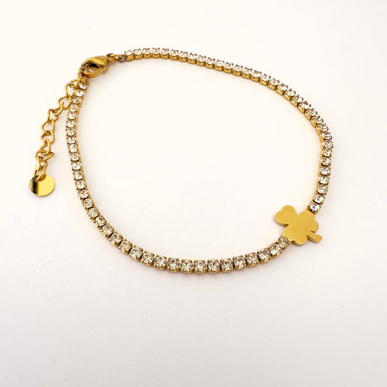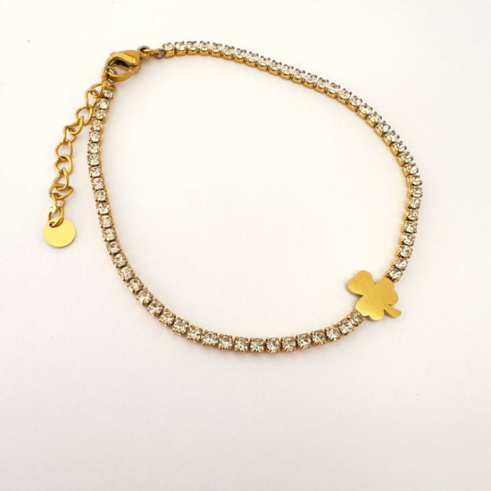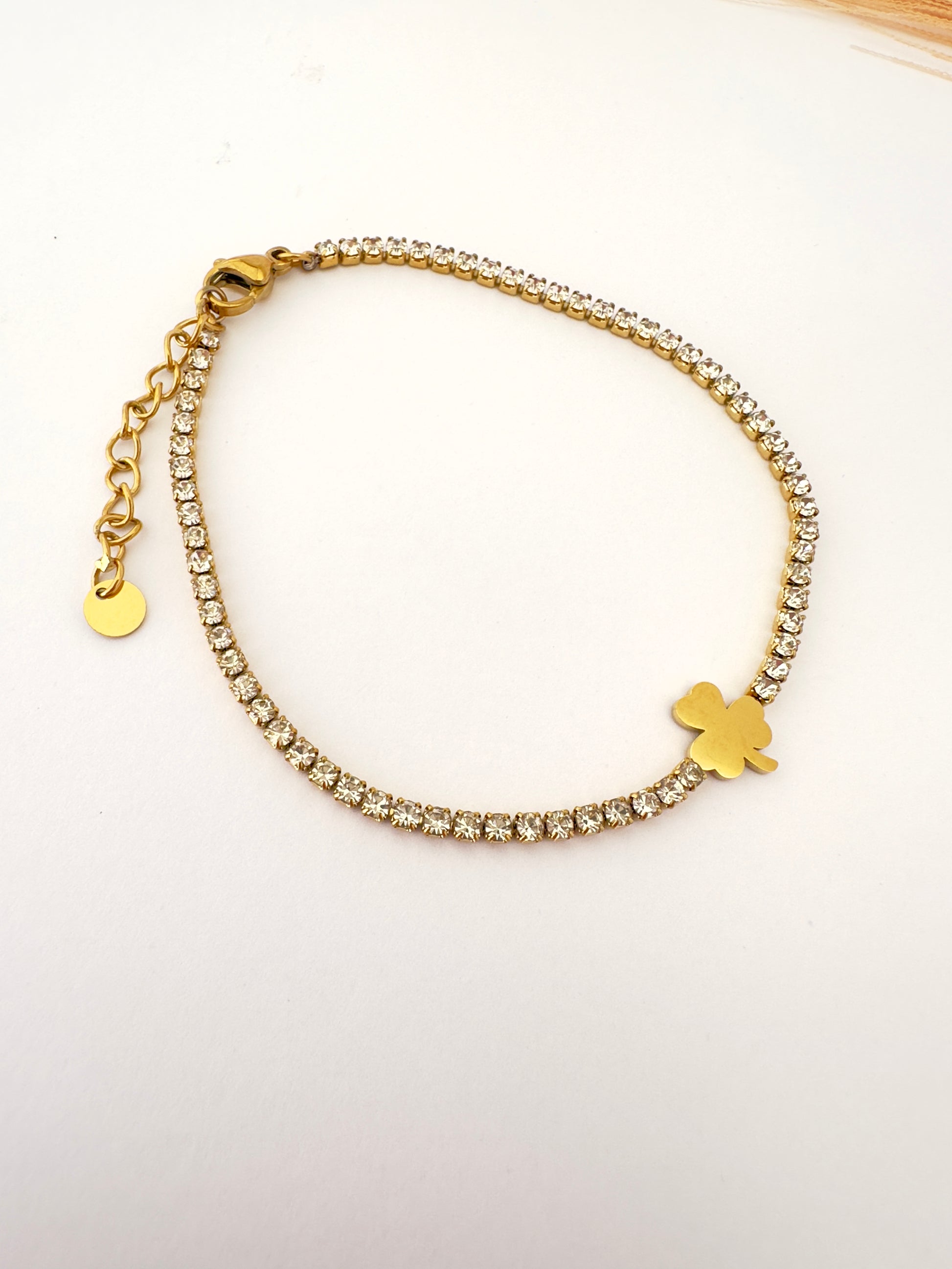 Diseño: Pulsera tipo tennis con cristales y dije de trébol dorado
