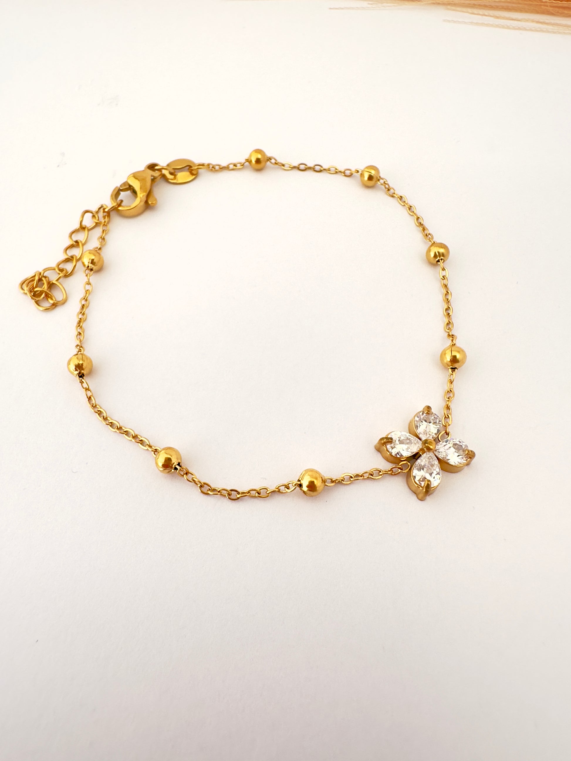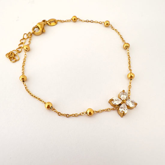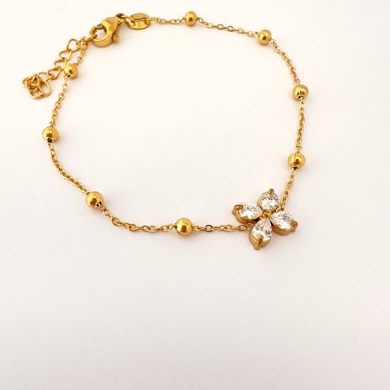 Diseño: Pulsera con esferas doradas y flor de cinco pétalos con cristales