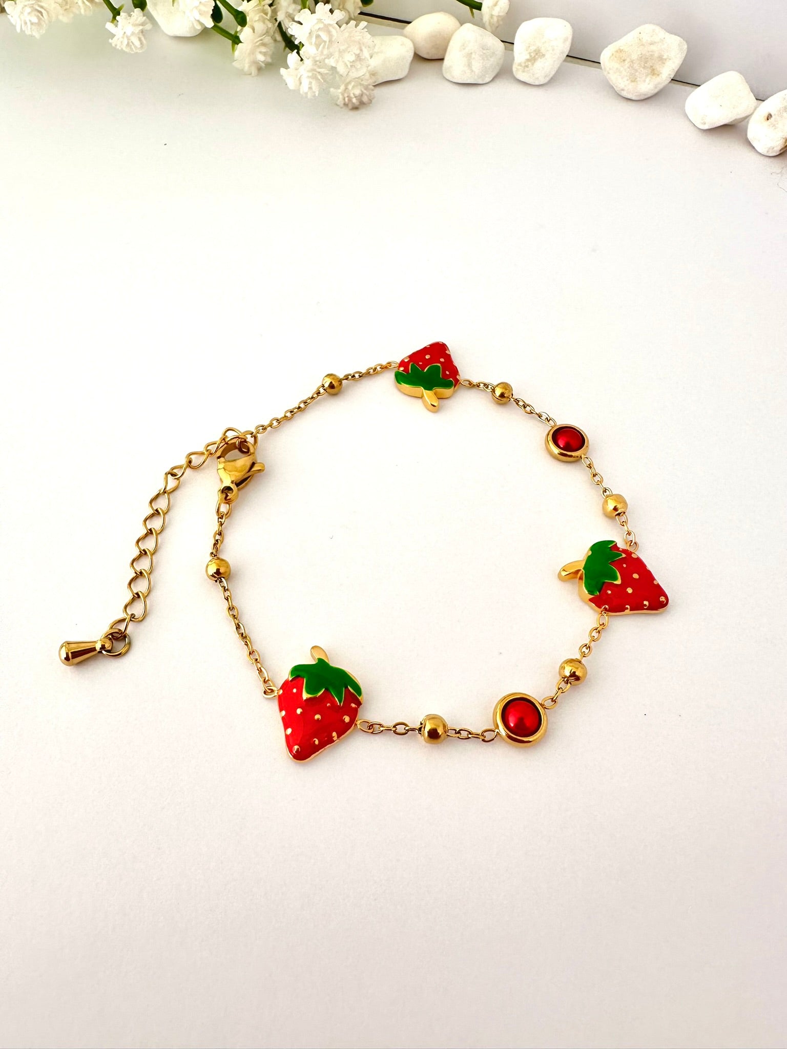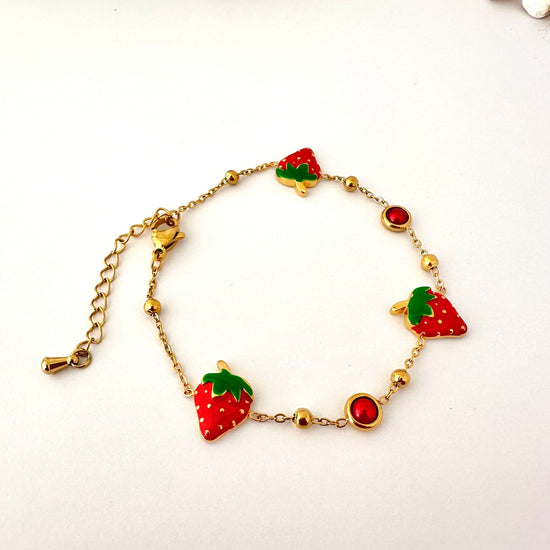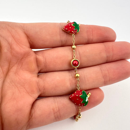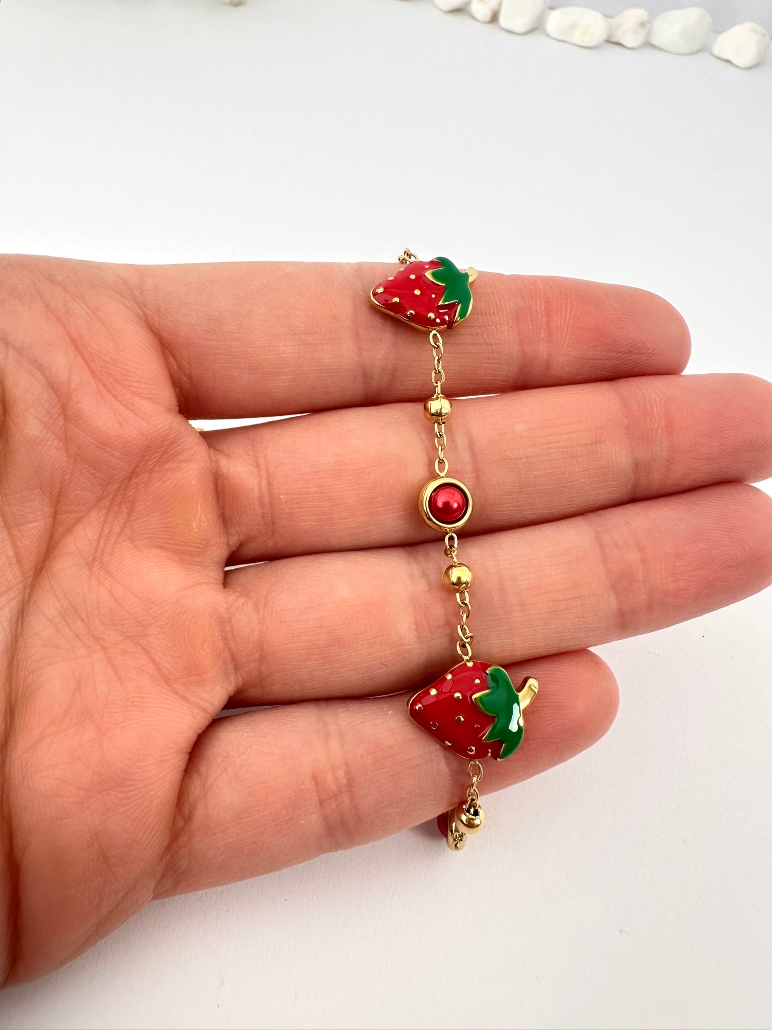 Una joya divertida, colorida y encantadora. La pulsera Frutilla Dorada combina el brillo del oro con el toque alegre del esmalte rojo y verde, evocando frescura y vitalidad. Su diseño con pequeñas frutillas distribuidas a lo largo de la cadena la convierte en una pieza perfecta para añadir un detalle único y lleno de energía a cualquier look.