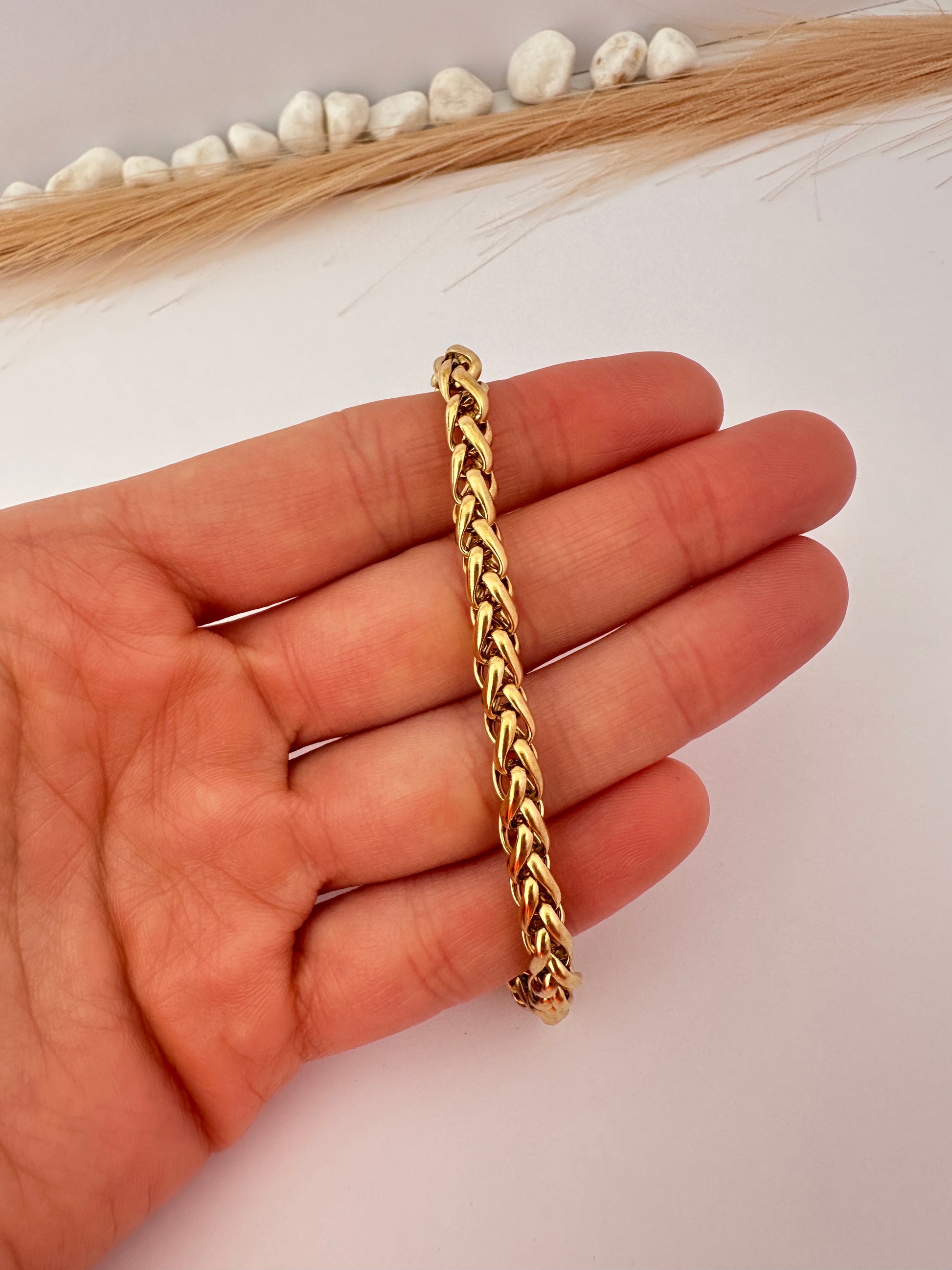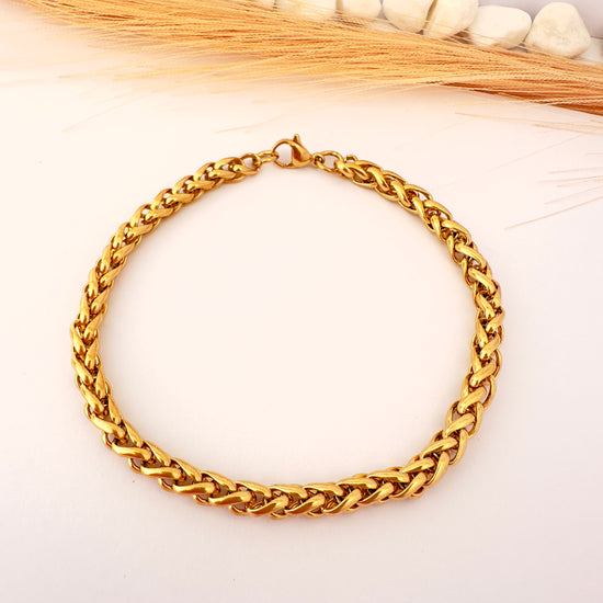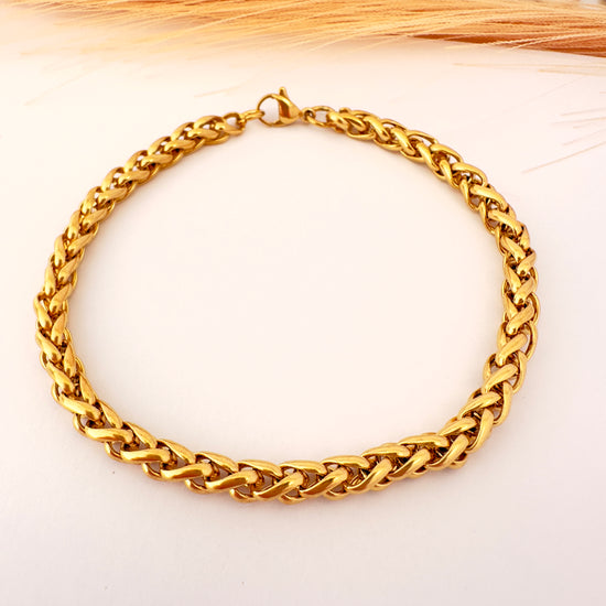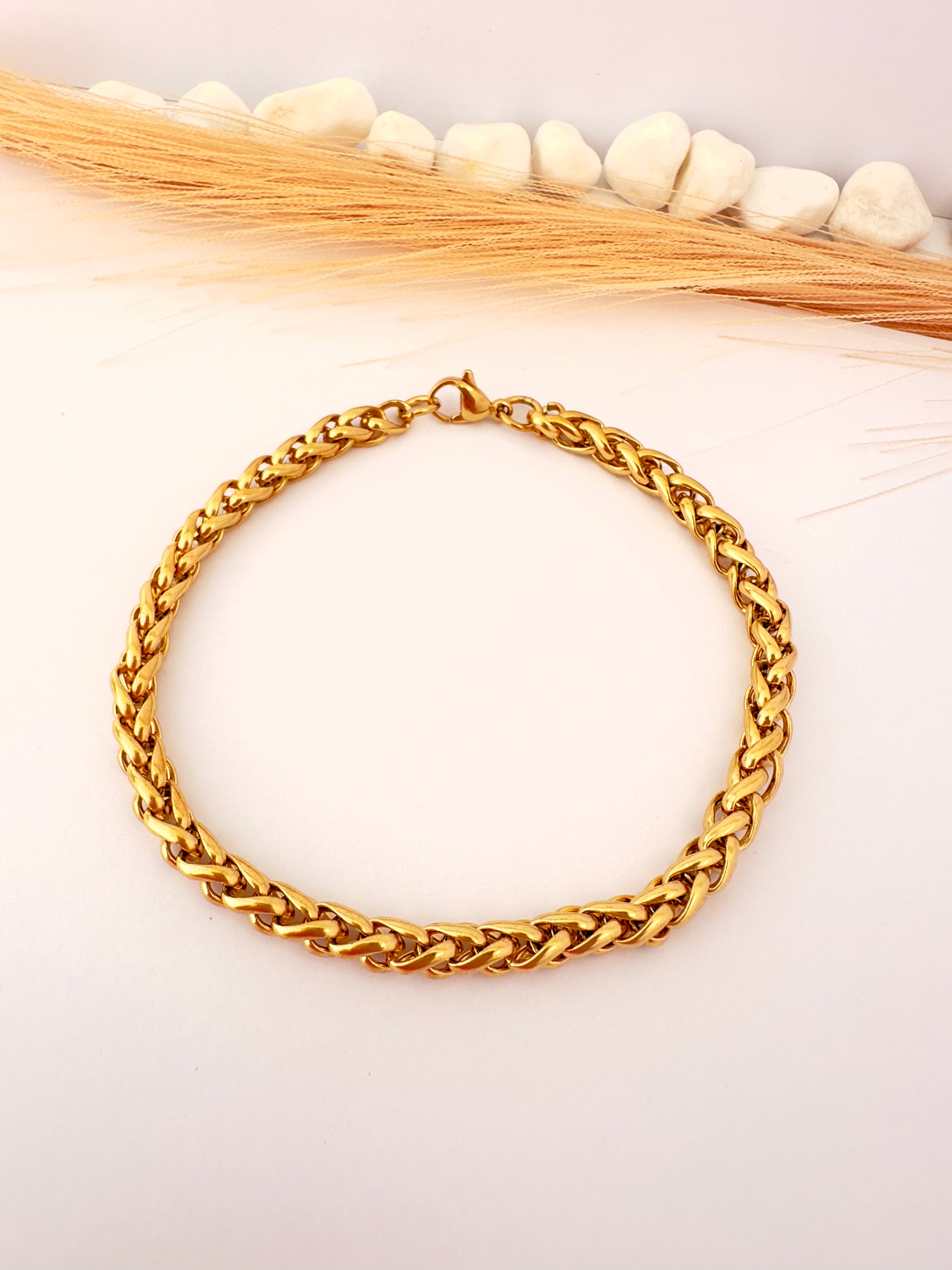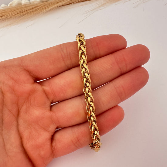 Diseñada con el clásico tejido cubano, esta pulsera es un imprescindible en cualquier colección de joyería masculina. Su diseño entrelazado aporta presencia y estilo, ideal para quienes buscan un look sólido y elegante. Gracias a su tono dorado intenso y acabado pulido, es una pieza que combina con todo tipo de vestimenta, desde lo casual hasta lo formal.